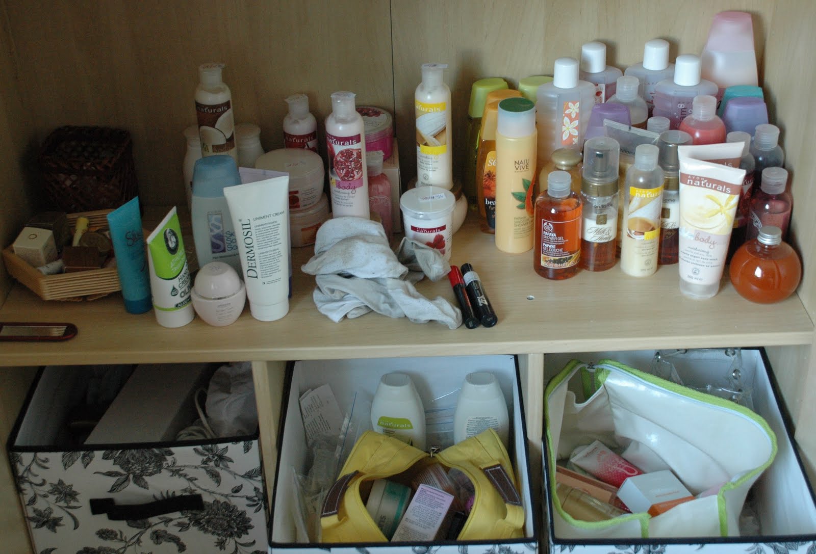 Ja sitten alempien hyllyjen tuotteet eli vasemmalta lähtien huulirasvani, vartalovoiteeni (kosteutta sitovat sukkanikin jääneet näköjään kuvaan...), pari ripsiväriä ja suihkugeelini. Ja alempana kosmetiikkalaukuissa erinäisiä tuotteita...